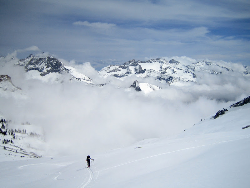 The cloud layering today was awesome. Nick skinning on the other side of the pass. Photo: Dostie: