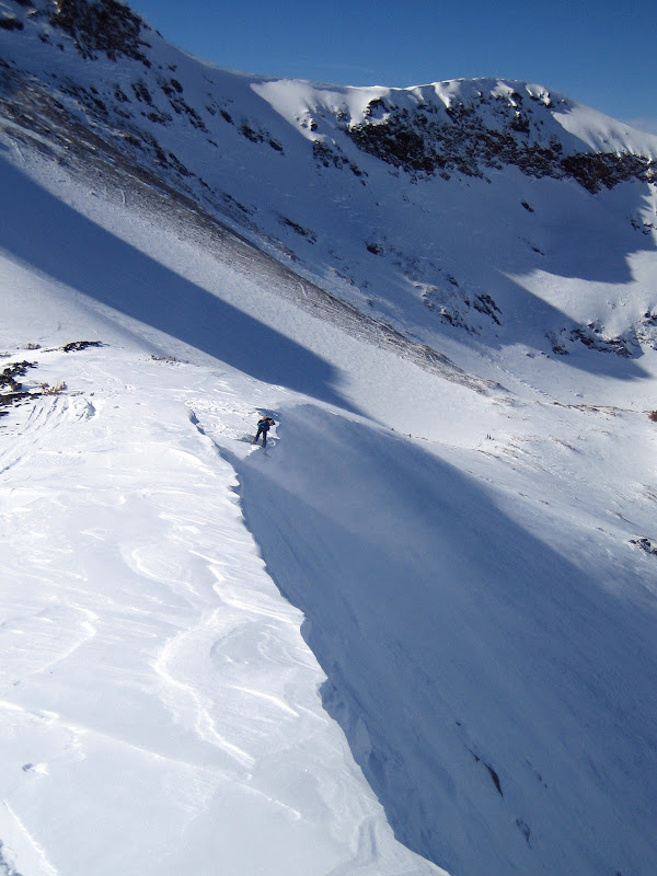 After dropping two 150-175 lb cornices (which took a while), nothing moved on the slope. We were aware there were some surface windslabs, but were comfortable they would be surface action and slow moving. During the descent, Alex set off one that had a 2-3 inch crown and only slid about 20 feet. He saw the slab begin to ripple downslope so he made a hard board-cut and rode off to the side to let it go.